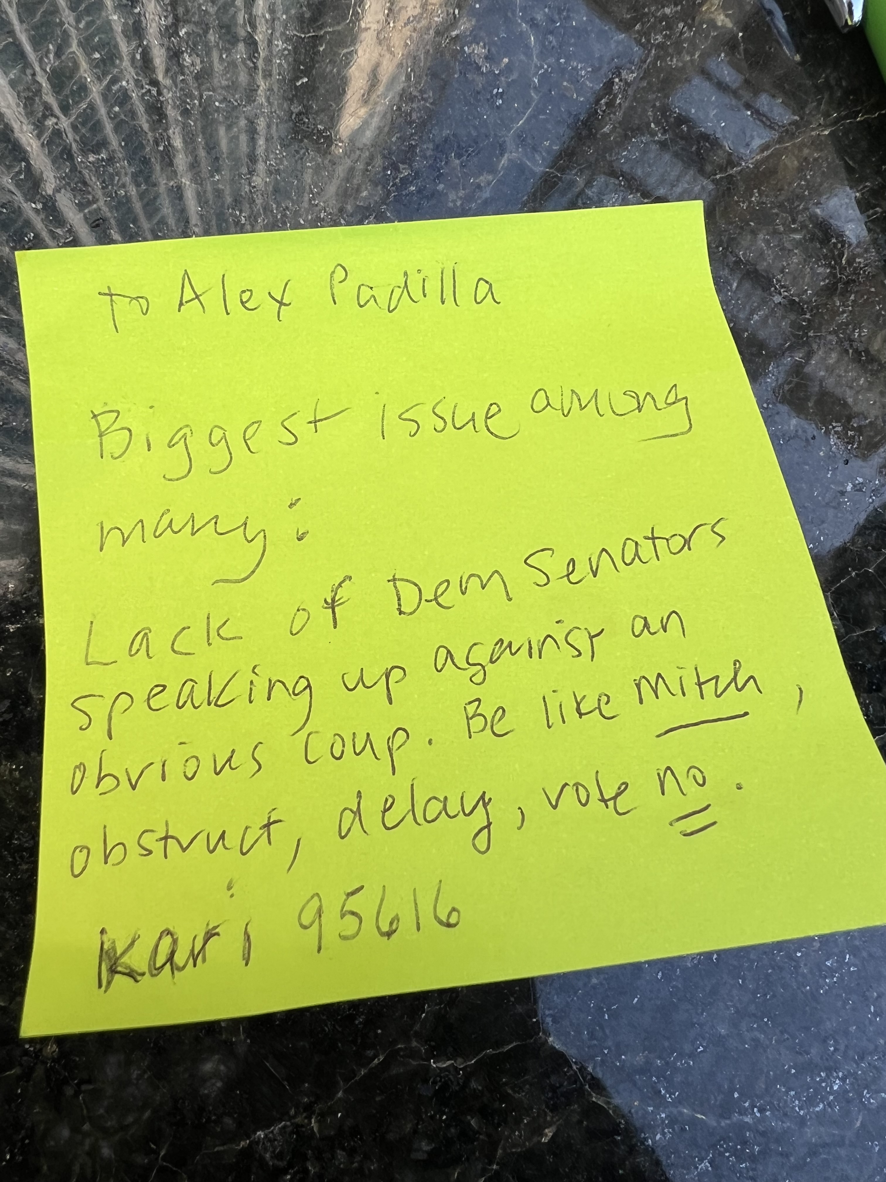 We showed up at 10:30 and were so thrilled to see a large crowd, which grew and grew. We listened to Irene (the woman from San Diego), who led us in chants (sure, okay). She instructed us to write our key question and/or issue on a Post-it. Originally, the idea was to attach all the Post-its to Padilla’s office door, as his staff had been MIA for days (uncertain why). However, the staff had gotten wind of the gathering and showed up and, to their credit, were attentive/responsive to the crowd. Well, that’s their job. Many of us waited for our turn to address staff, which was satisfying. I liked the face-to-face.. after a few weeks of phone messages.