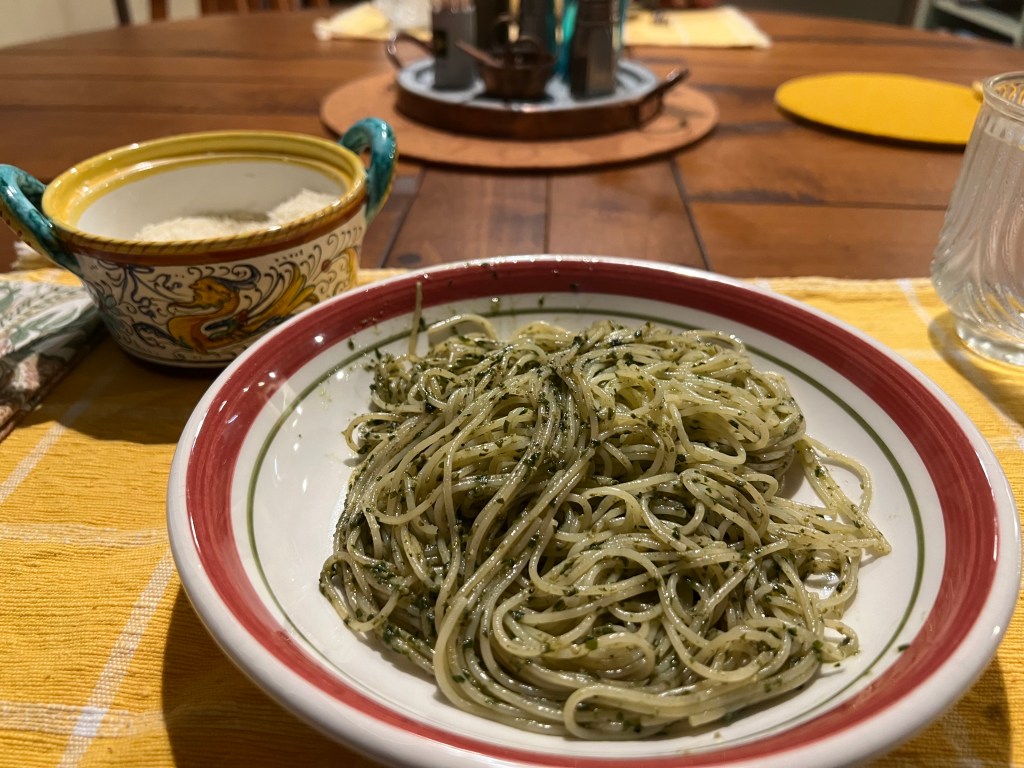 Her recipe is slightly different than pestos I’ve made in the past.. but not much. Hers has walnuts and pine nuts, and she adds a fair amount of salt and pepper. She also may use more garlic than most. I ended up not using as much oil as she called for.